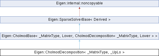 Public Member Functions inherited from Eigen::CholmodBase< _MatrixType, _UpLo, Derived > | |