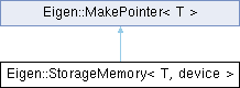 Inheritance diagram for Eigen::StorageMemory< T, device >: